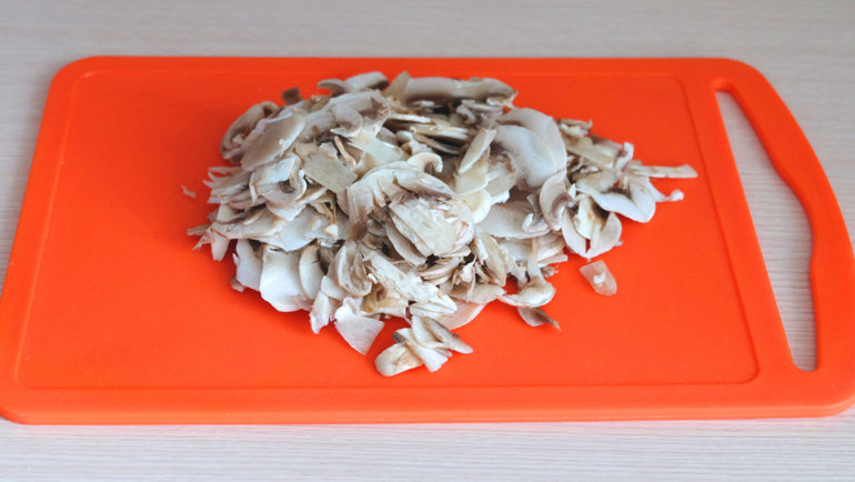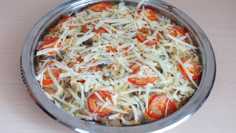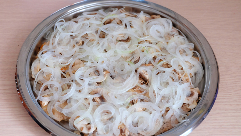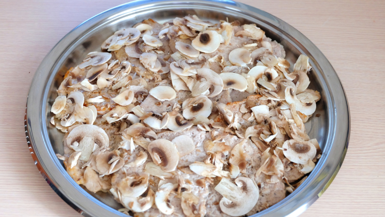 Форму для запекания смазать растительным маслом, выложить отбивные. Выложить слой грибов