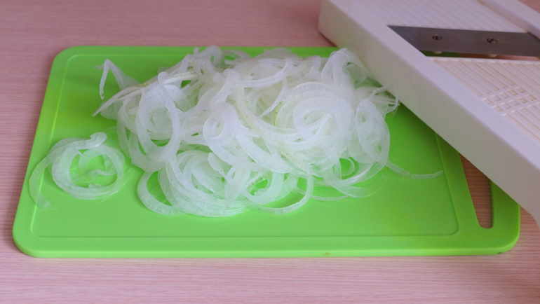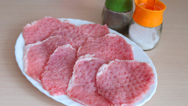 Мясо порезать пластиками толщиной в 1 см. Отбить с двух сторон