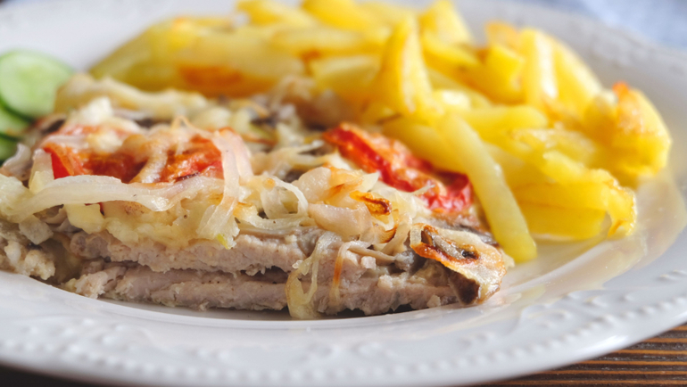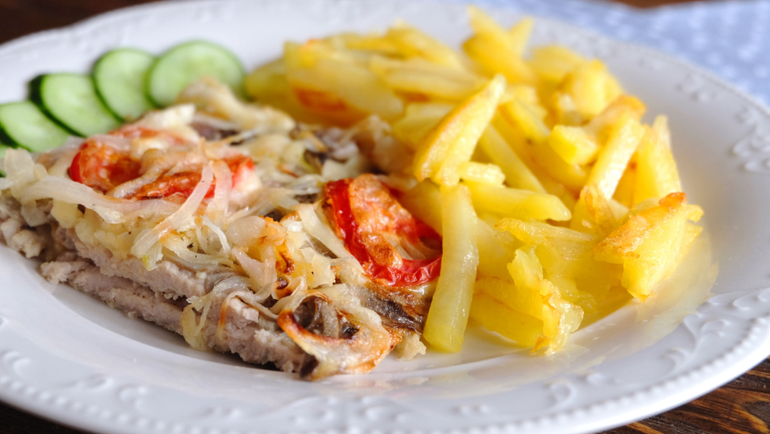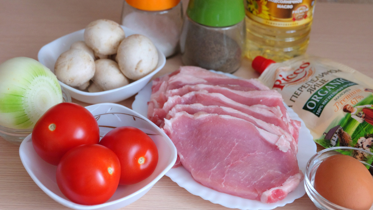 Отбивные из свинины, запеченные в духовке с луком, грибами и помидорами