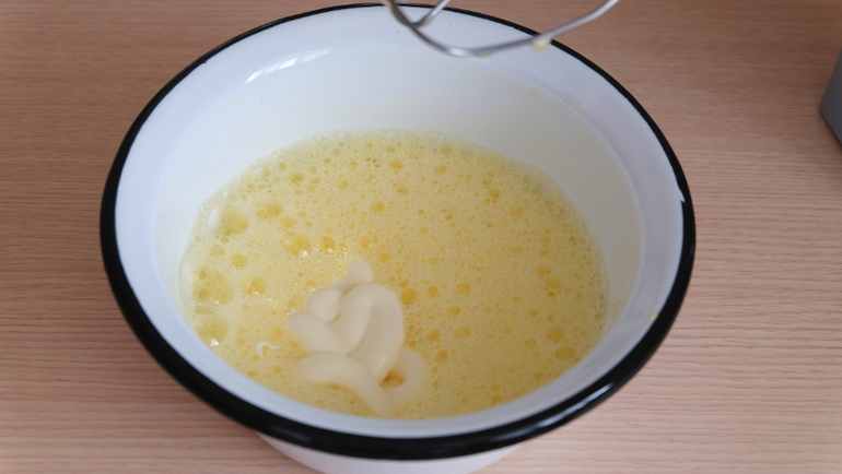 Яйцо взбить, добавить майонез, соль и черный перец по вкусу