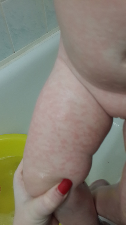 Пятна на попе, ногах, руках и на животике (но тут непонятно, то ли сосуды, то ли тоже пятна). Больше никаких признаков