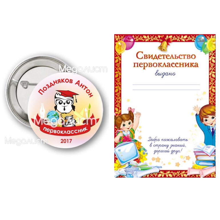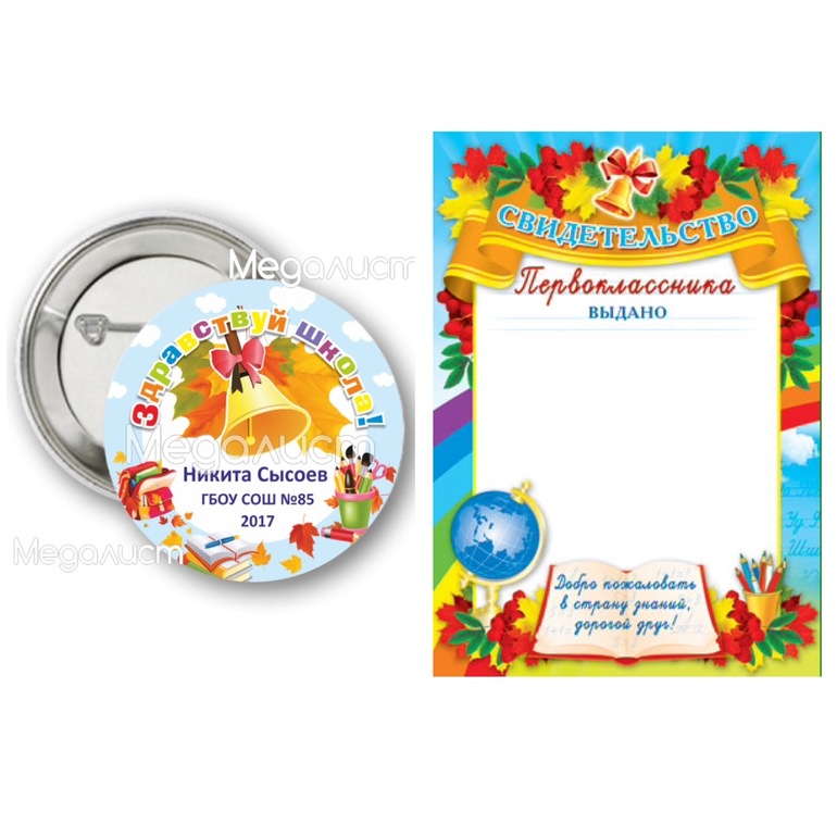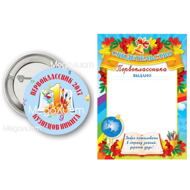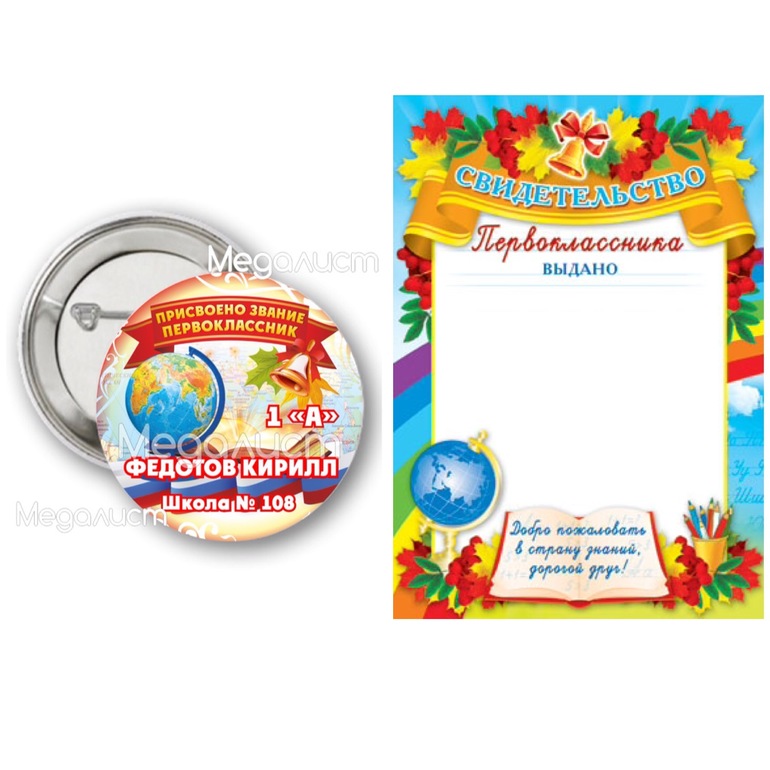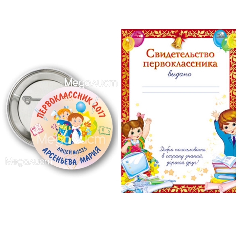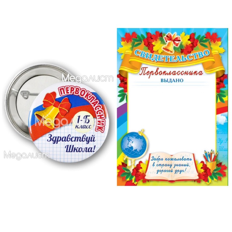 ЗначокНа праздник 1 сентября, День знаний, Первый звонок, Посвящение в первоклассники- предлагаю красочный набор "Закатной металлический значок на булавке + Свидетельство первоклассника .