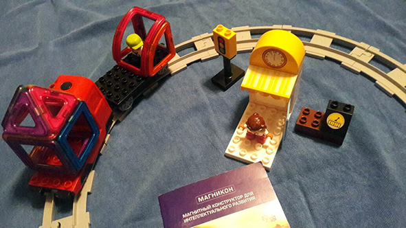 Купили сыну еще один магнитный конструктор, только взяли уже не для малышей, а МК-68 с железной дорогой и поездом на батарейках