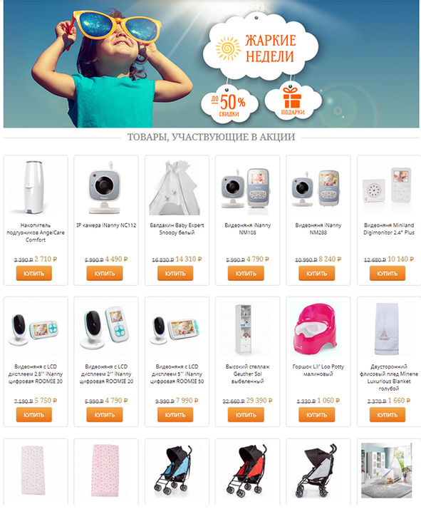 В салоне 9 июля началась акция "Жаркие недели". Скидка до 50% на товары для новорожденных деток - видеоняни, стульчики для кормления, на детскую мебель, термопоильники и на другие прибамбасики для малышей