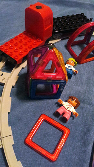 Поезд собирали вместе, вместе и отправили в путь. Едет он не быстро, но устойчиво, с полотна не сходит и во время движения/торможения издает соответствующие звуки. Увлекшийся ребенок запустил поезд и по паркету, то же самое, хорошо катится. В наборе, ка я уже сказала, не все элементы магнитные, есть и просто пластиковые, которые собираются, как у Лего. Кстати, Никита быстрее меня сообразил, что можно играть одновременно с двумя конструкторами, Магникон «Электропоезд» и Лего прекрасно совмещаются. И число пассажиров увеличил за счет своих роботов-солдатиков, даже фигурки животных пошли в дело. В общем, подошел к игре со всей ответственностью :).