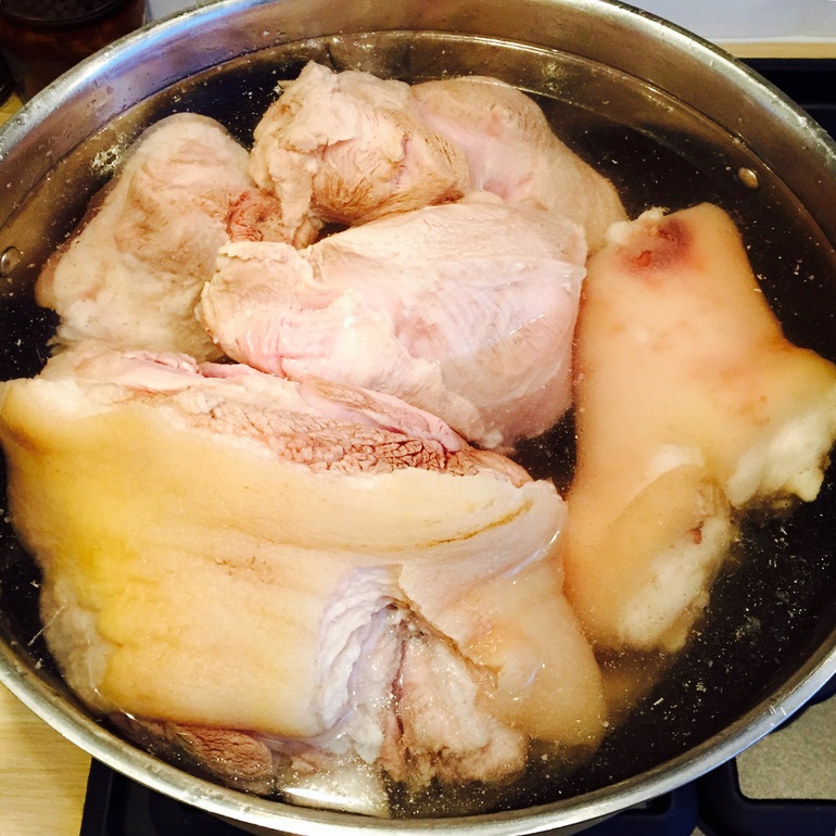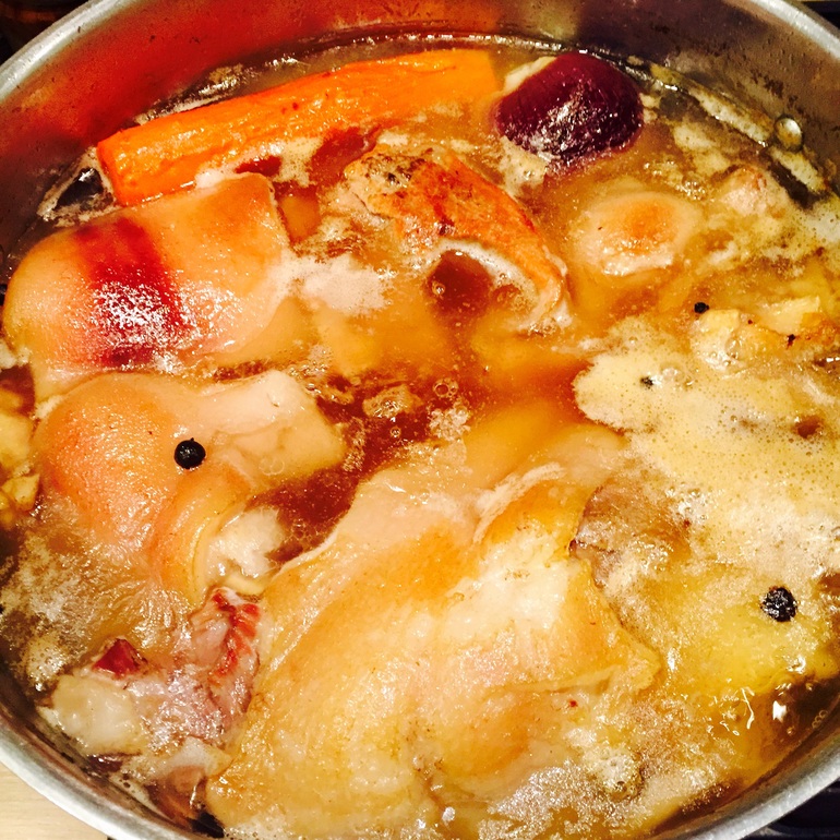 Мы обязательно их ВЫМОЧИЛИ в холодной воде сутки. мастхэв. Это очень важно. Чтоб во-первых, ушла сукровица из мяса, во-вторых - чтоб почистить шкурку.