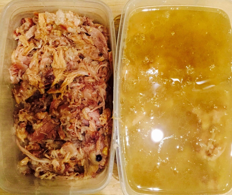 Ота. Две миски мяса и бульон отдельно. Поехали разбирать мяско. РУКАМИ. От косточек, жирка, хрящиков.