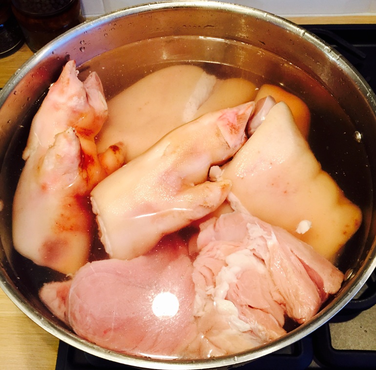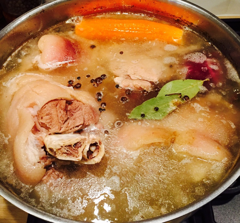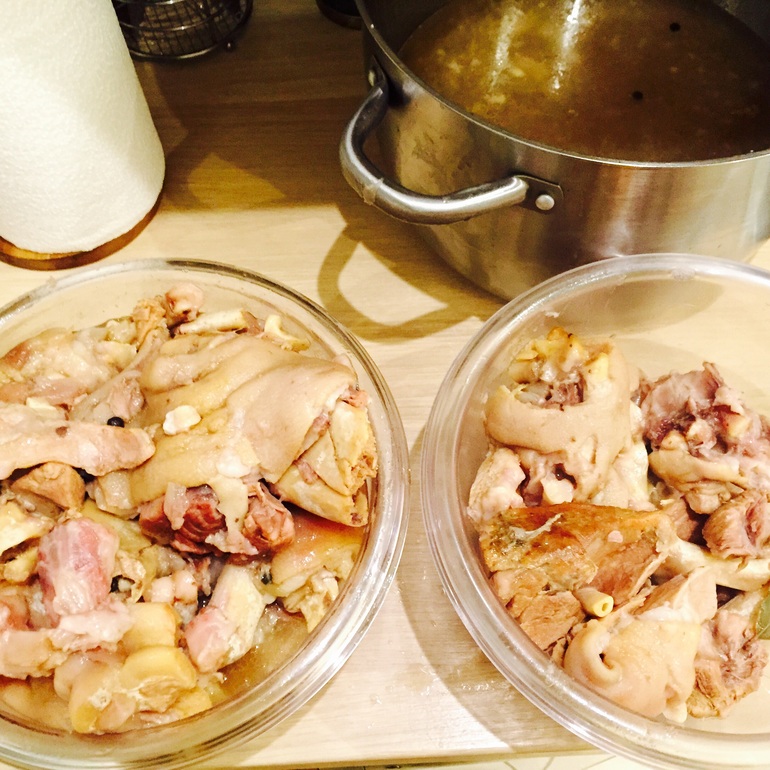 Я вот тут отступлю - не очень поняла мамин рецепт, и взяла не только копытца, а ножки по коленку - это ту мач. Много их. Свин был большой, ноги у него огого. Достаточно было две. А лучше - три ноги, но только по коленку, ибо копытца - самая важная холодцообразующая часть.