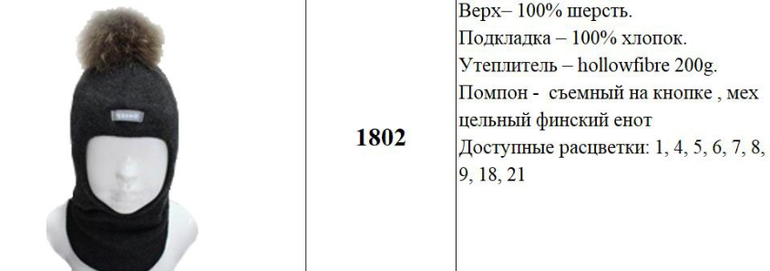 Верх- 100% шерсть. Подкладка - 100% хлопок. Утеплитель - hollowfibre 200g. Помпон - съемный на кнопке , мех цельный финский енот Доступные расцветки: 1, 4, 5, 6, 7, 8, 9, 18, 21