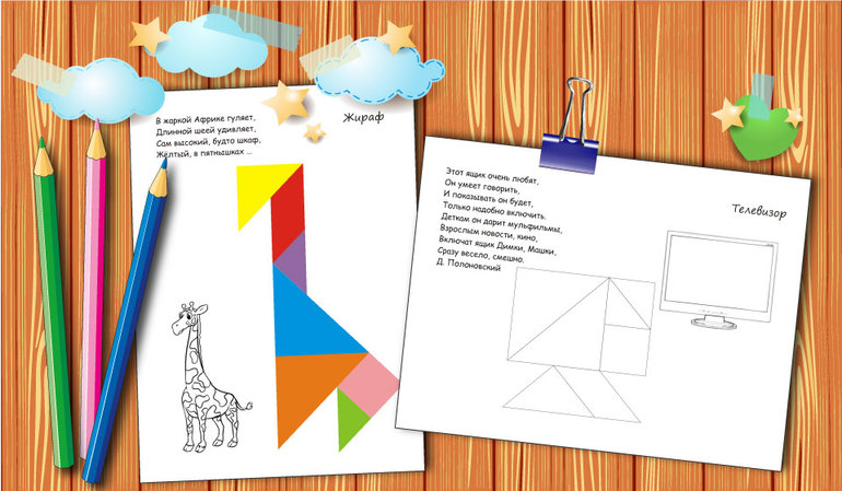 - Рисунок рядом с каждой схемой подобран так, что он максимально отражает силуэт этой схемы, что помогает ребенку увидеть то, что он собрал из танграма и тем самым способствует развитию воображения.