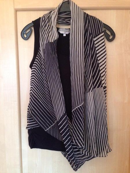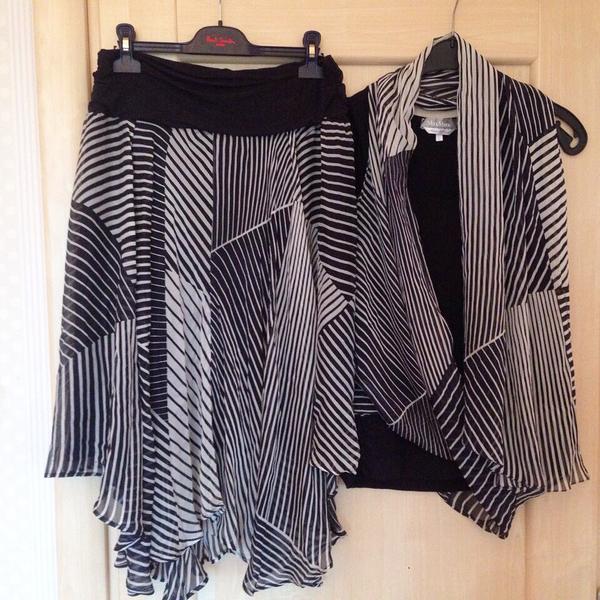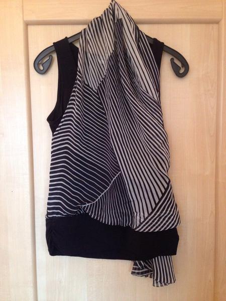 6. Летний костюм Max Mara в отличном состоянии. Размер: L, на 46-48 размер. Юбка в поясе на резинке, на подкладке, не просвечивается. Топ со свободной драпировкой полосатой ткани\ нижний топ майкой. Цвет комплекта: черно-белый. Выгодный фасон, скрывает все несовершенства фигуры. Легкий, удобный. Цена: 7000 руб.+ почта.