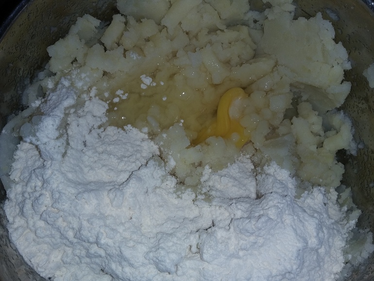 После ПОЛНОГО остывания картошки добавляем 1 яйцо и 3 ст.л. муки: