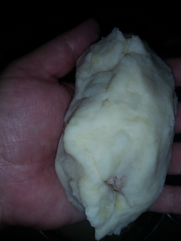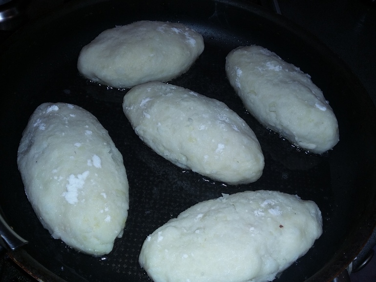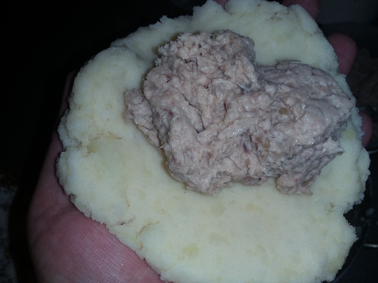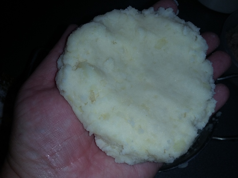 Берем в руку комочек картофельного теста, расплющиваем в лепешку: