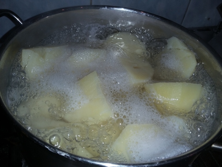Итак, чистим 1 кг картошки, заливаем кипятком и варим с солью до готовности: