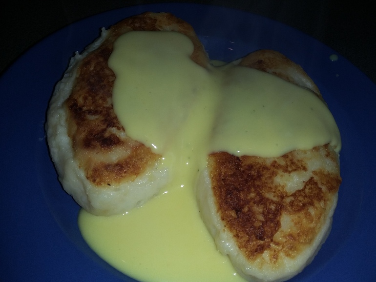 На сковороде нагреть растительное масло с кусочком сливочного. Выложить картофельные оладьи: