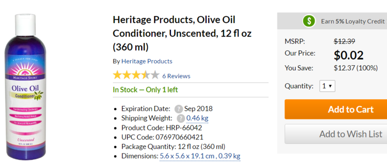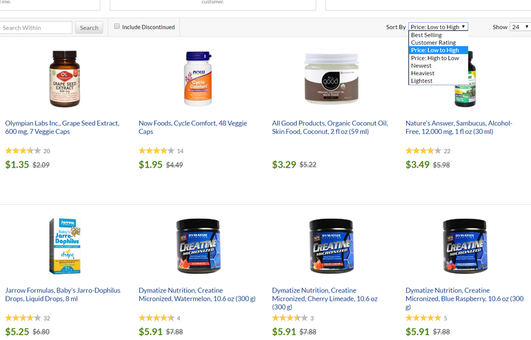 8) Аналогично, сортируем товары по возрастанию цены в Новинках. Через небольшое время значительная часть этих товаров подорожает. Например, сейчас там есть большая 858-граммовая банка органического кокосового масла extra virgin за 14,3$, при том, что обычно кокосовое масло extra virgin стоит примерно столько же за банку в 2 раза меньше.