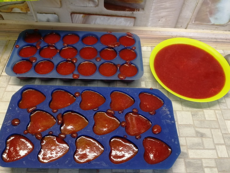 Подсмотрела как подруга замораживает в контейнерах клубнику, чуть разбив ее блендером со щепоткой сахара. Сделала себе так десяток контейнеров. Но не съели за зиму, морозилка забита: