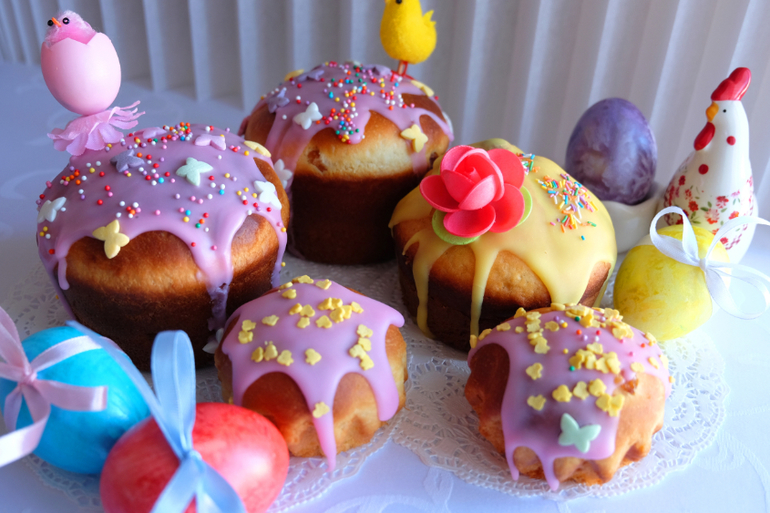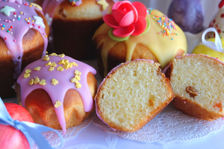 Готовые куличи остудить, полить сахарной глазурью или взбитыми белками с сахаром, украсить цветной кондитерской посыпкой