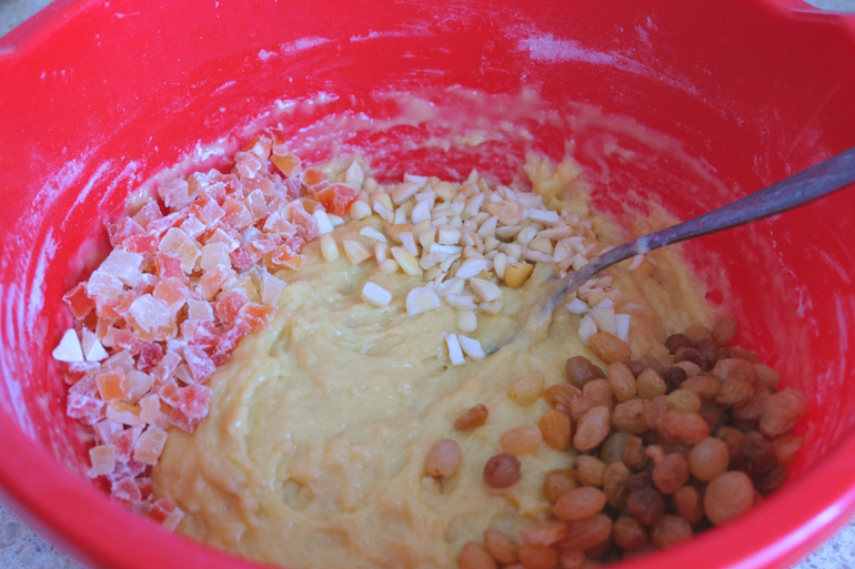 Добавить дробленый миндальный орех, изюм, порезанные цукаты