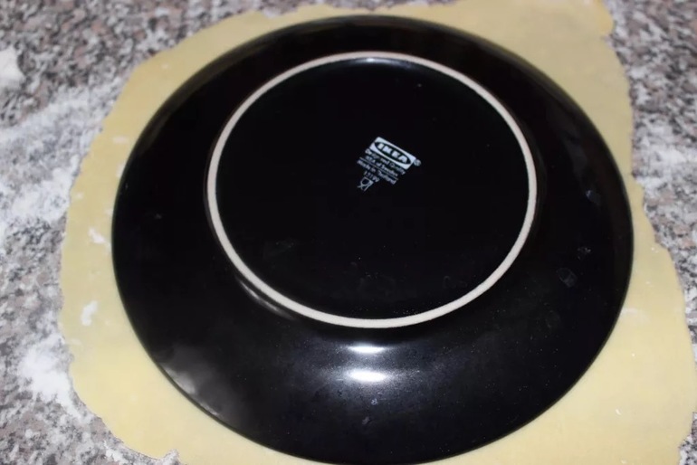 Тесто делим на 8-9 шариков. Раскатать каждый шарик в круг нужного диаметра, аккуратно обрезаем и переносим на разогретую сковороду