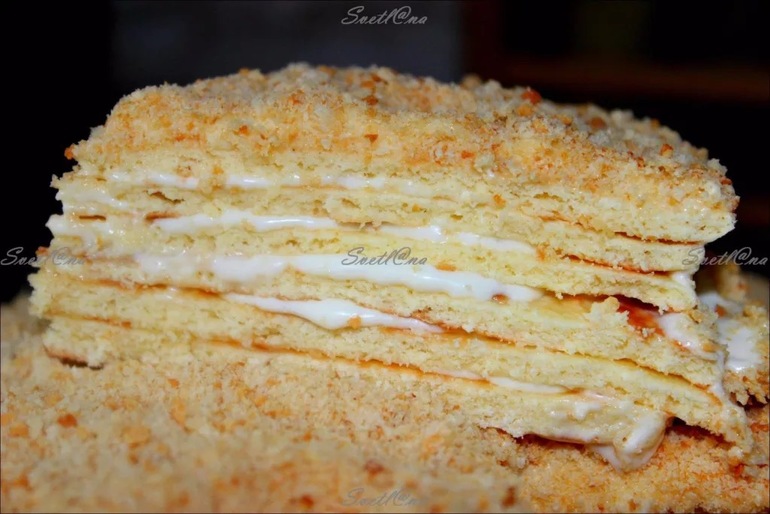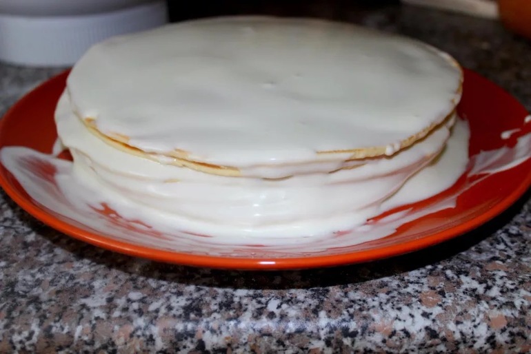 И так все коржи, теперь делаем крем: взбиваем сметану с сахаром и добавляем ванилин, крем конечно можно любой, обильно смазываем коржы