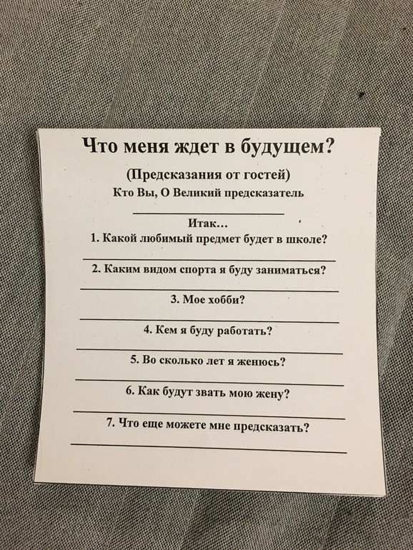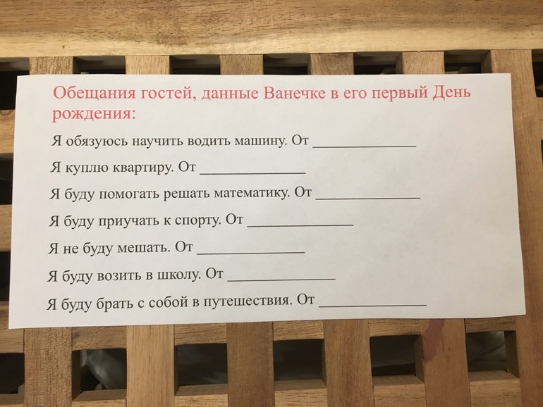 Гости вытаскивают бумажки, на которых написано, что в будущем должны будут сделать для Вани.