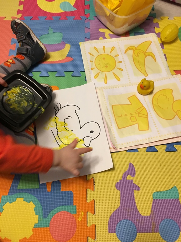 Творчество: рисование пальчиковыми красками. Нашли уточку в книге, покрякали и нарисовали.
