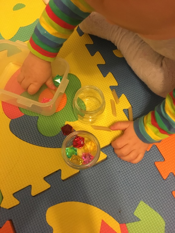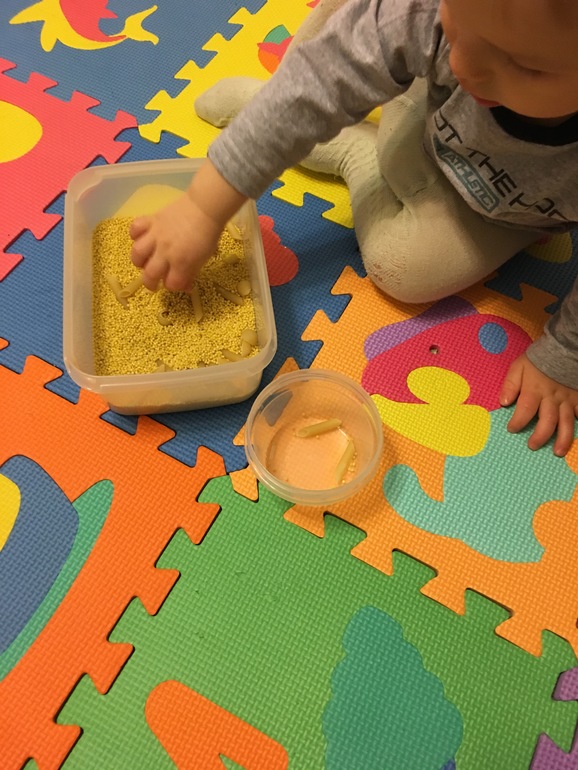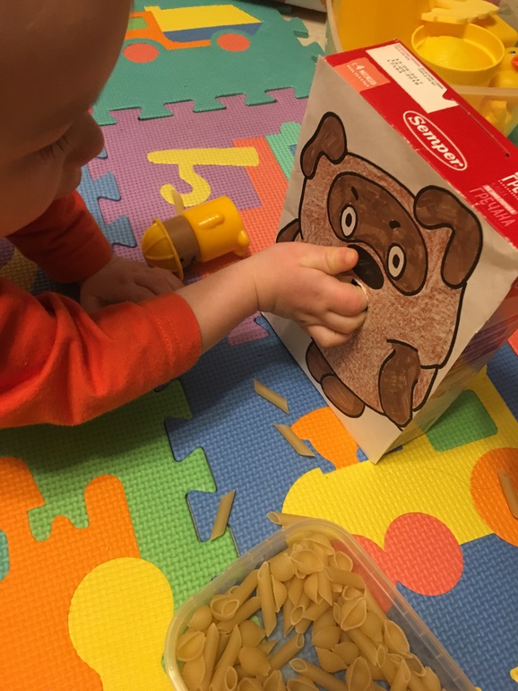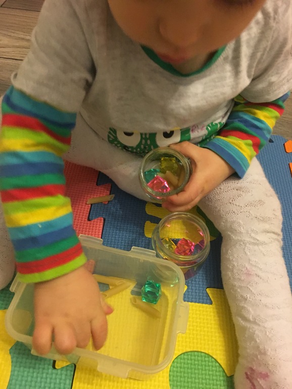 Камушки сразу клал в баночку, а вот макароны только на пол) Просидел минут 15, раскладывал камушки по баночкам