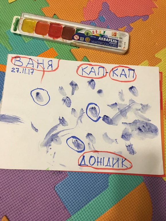 Творчество. Рисование красками. Рисовали красками кисточкой дождик «кап-кап». Потом фломастером обвели капельки, подписали картину, обвели слова фломастером.