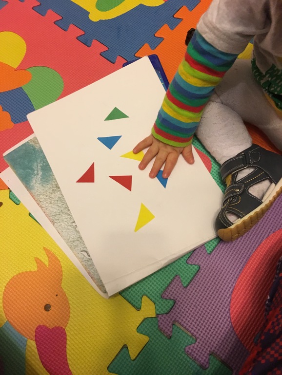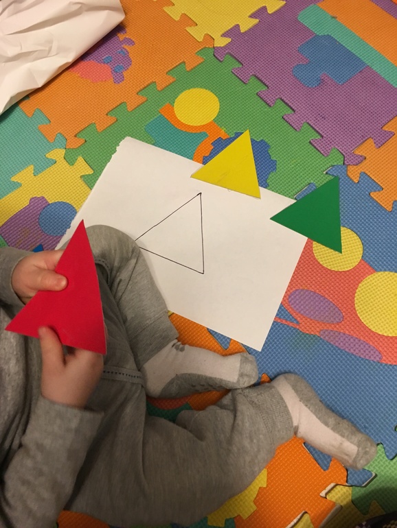 Форма-треугольник. Искали треугольник среди других фигур и клали в коробочку.