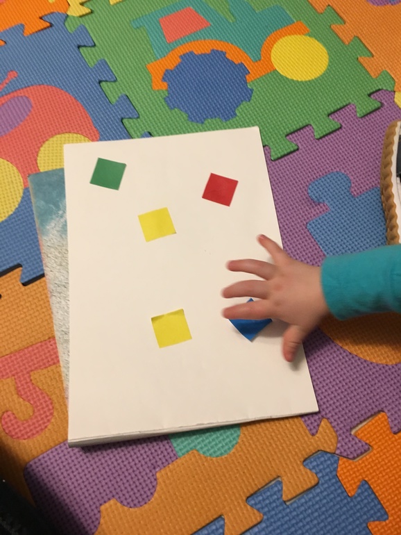 Форма - квадрат. Ищем квадраты среди других фигур и кладем в коробку.