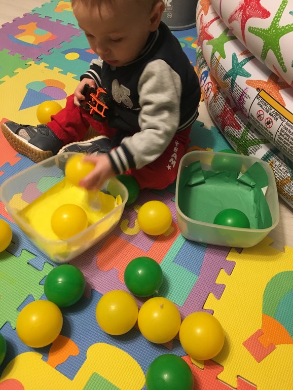 Цвет-желтый и зеленый. Раскладываем шарики по коробкам.