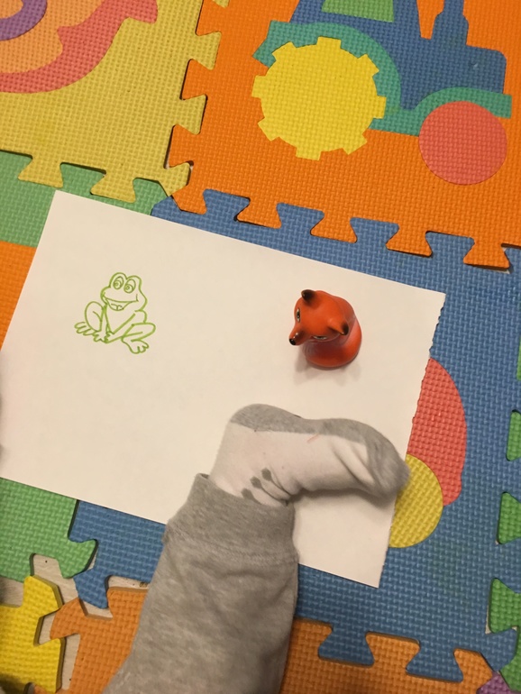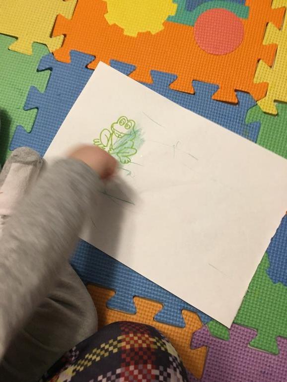 Творчество: рисование карандашами. На листочке я заранее нарисовала лягушку. Пришла лиса и хочет съесть лягушку.