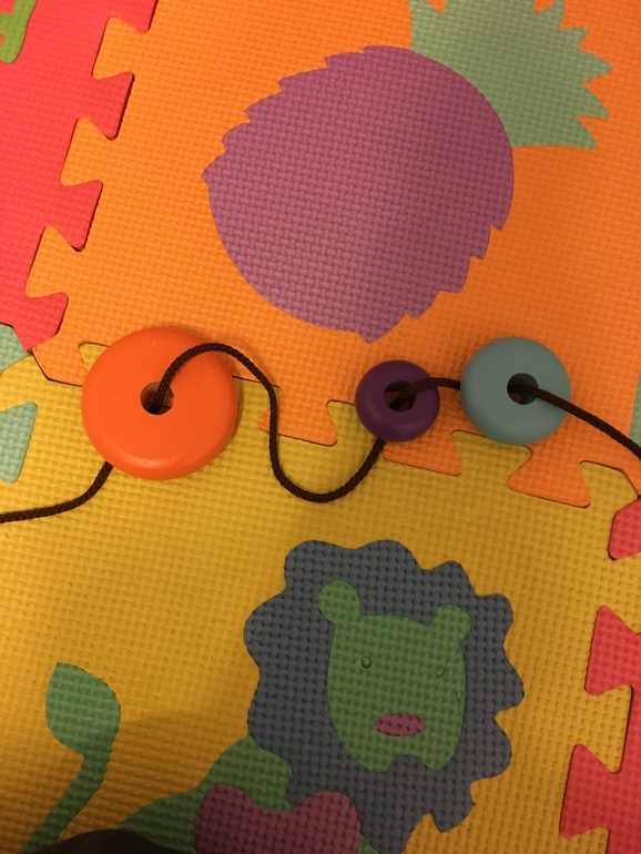 Игры на мелкую моторику: «бусы» одеваем кольца пирамидки на веревочку. А держала шнурок, сынок пробовал просунуть колечко
