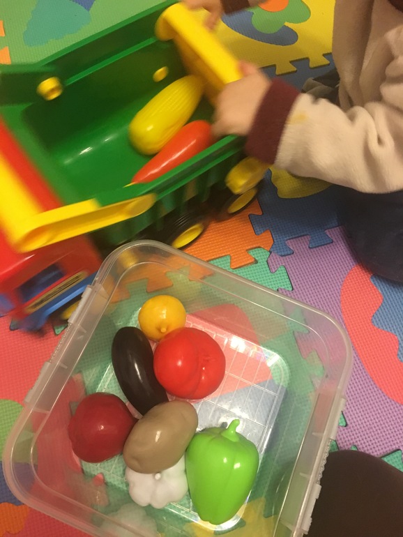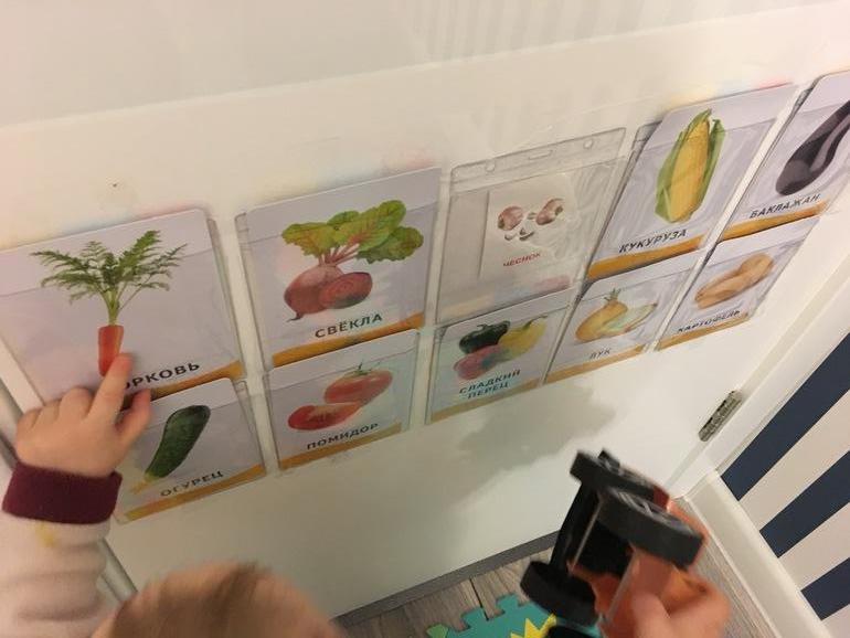 . Смотрим карточки, соотносим с фруктами и традиционно катаем в тележке)