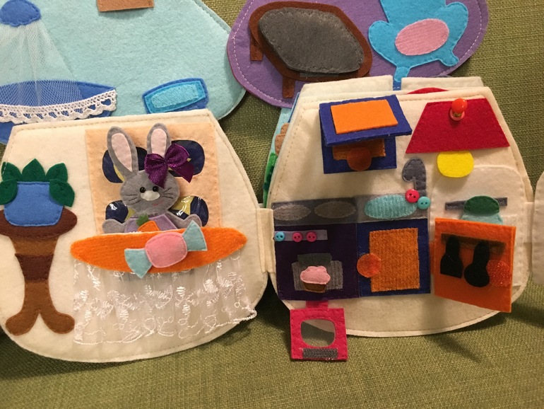 В окошке меняется день-ночь, на кухне зажигается свет, в духовке готовится кекс, в шкафчики и холодильник можно положить продукты. За стол садятся зайчики и угощаются конфетой