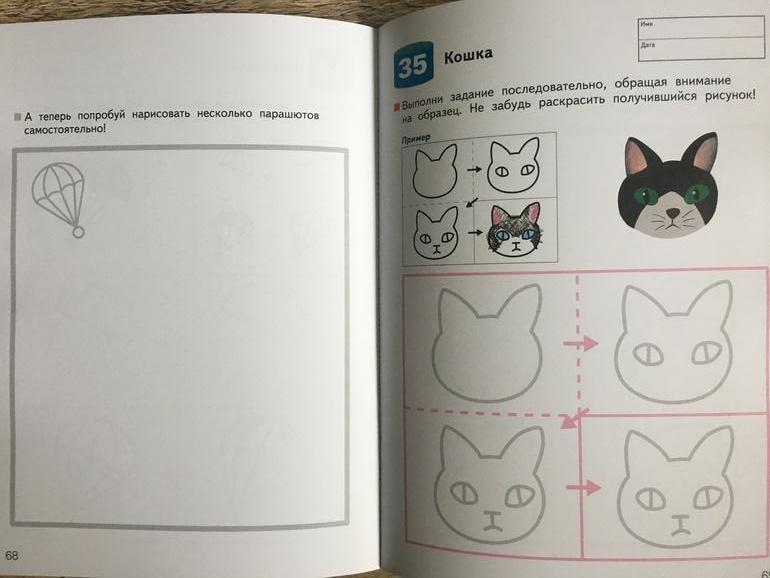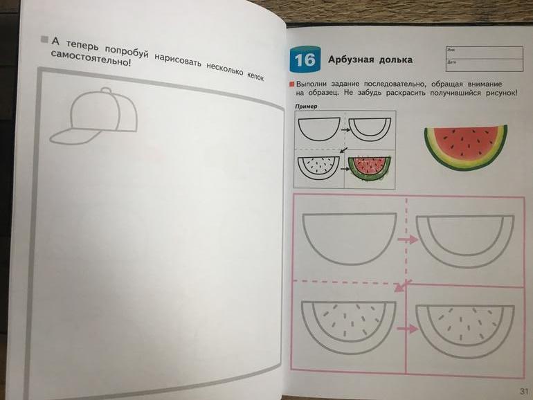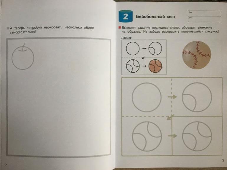 Тетрадь толстая, формата чуть больше А4, содержит 40 заданий. Бумага плотная, что позволяет рисовать не только карандашами и фломастерами, но и красками. Предметы для рисования: фрукты, игрушки, предметы одежды, животные. В каждом задании есть пошаговый образец, как нарисовать предмет в 4 этапа, крупные картинки, чтобы обводить по контуру и раскрасить получившееся изображение. На обороте есть место, где ребенок самостоятельно может нарисовать предмет. Задания постепенно усложняются.
