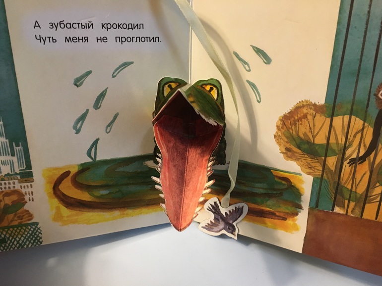 Герой «перелетает» со страницы на страницу. Птичка прикреплена к ленточке, что дает возможность побывать в клетках животных. А на последней странице появляется 3д крокодил. Самое любимое место в книге