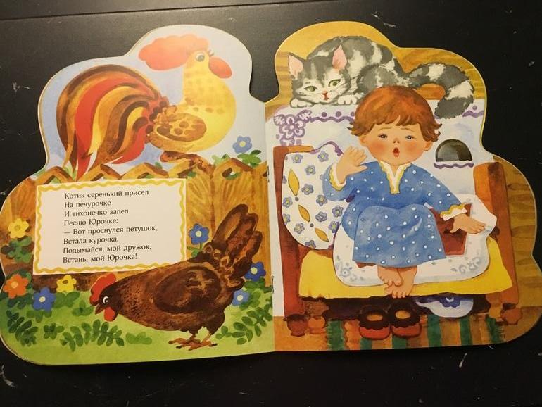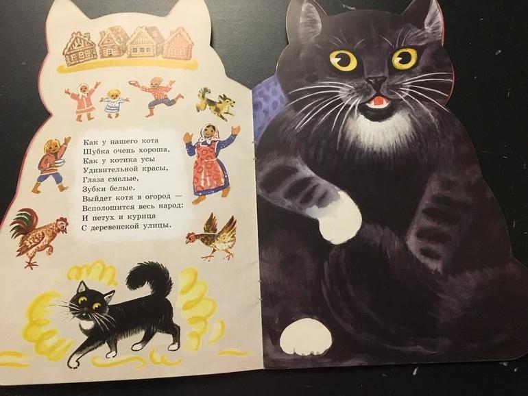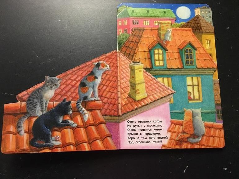 Картонная книжка с вырубкой. Стихи не очень, но картинки нравятся. Всегда ищем спрятавшихся котиков.