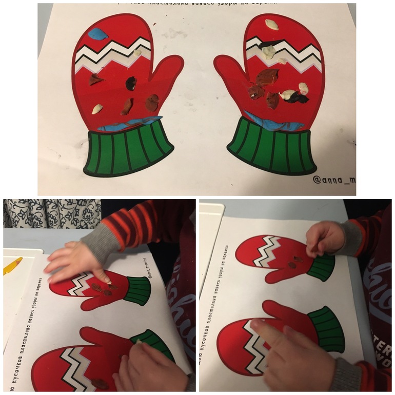 В заключении украшаем пластилиновыми шариками зимние рукавички