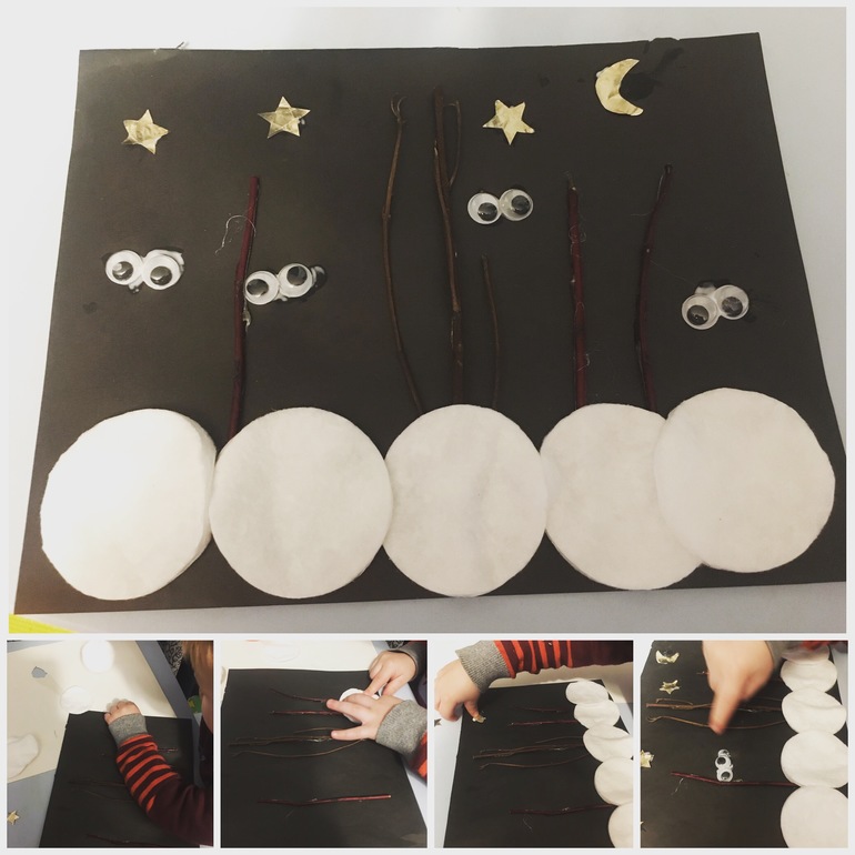 Из поделок - аппликация из ваты и веточек- зимний ночной лес. Идею подсмотрела у мамы Инны-очень мне показался забавным!