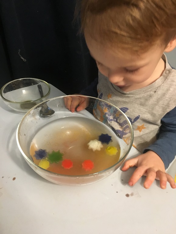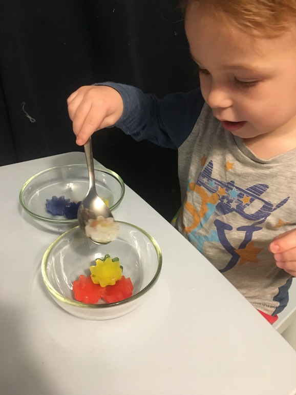 Достали лед. Для интереса я сделала лед цветным. Потрогали, проговорили свойства - холодный, скользский, гладкий. Перекладывали из одной мисочки в другую с помощью ложки