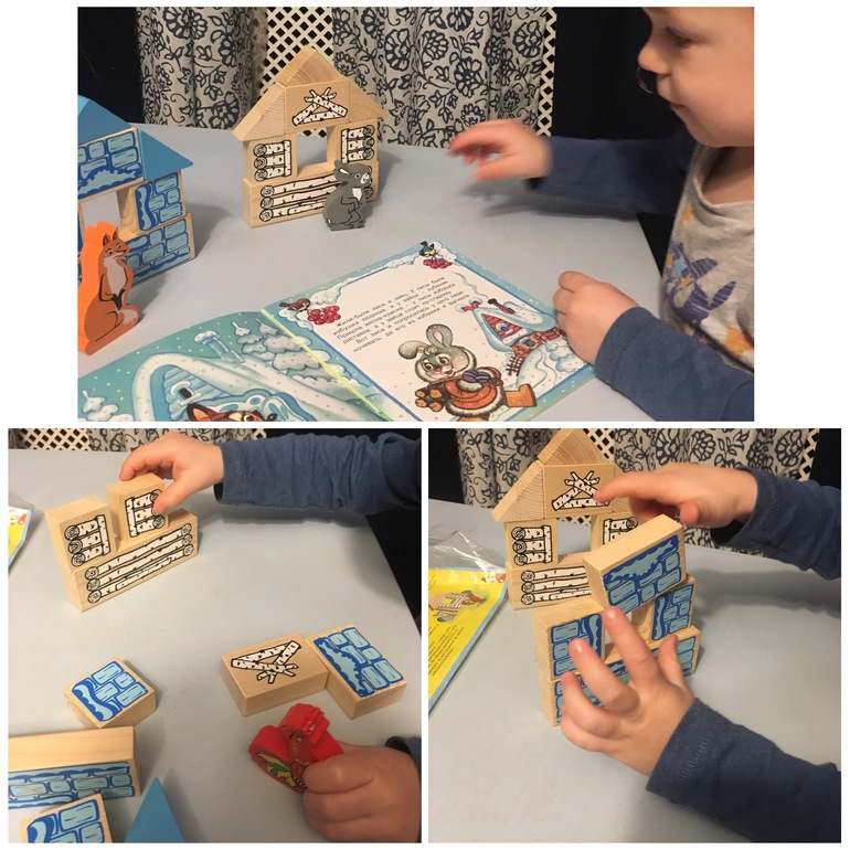 Сначала прочитали сказку «Заюшкина избушка». Показала настольный театр. Вместе построили домики для героев.
