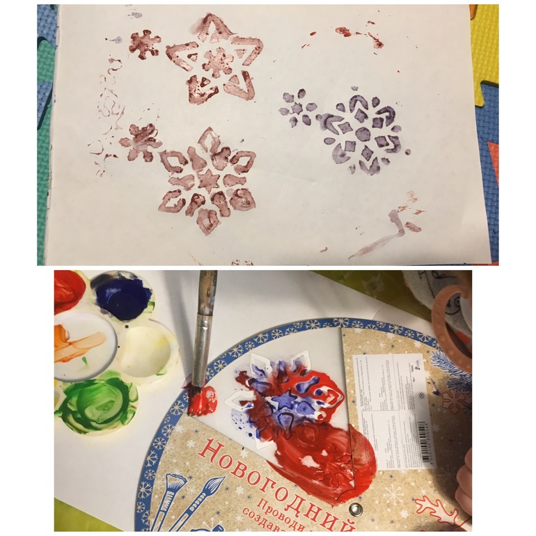 и раскрасил восковые снежинки (обвела свечкой по контору рисунка) краской