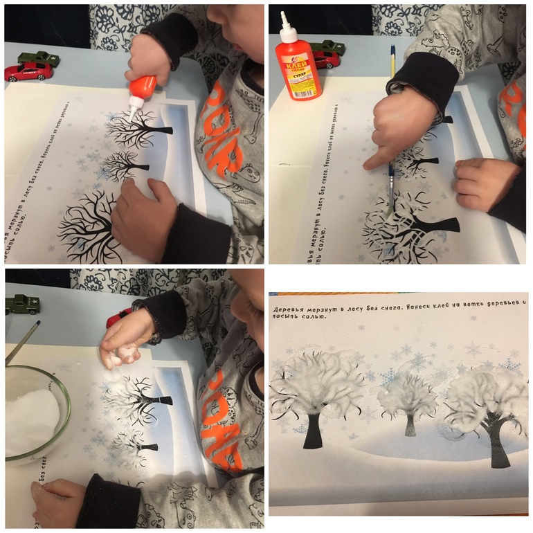 Сделали аппликацию солью-деревья в снегу