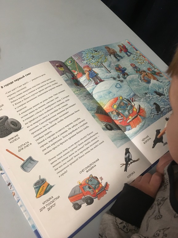 Посмотрели книгу «находилки-развивалки» про снег в городе. Вспомнили, что видели на улице сегодня