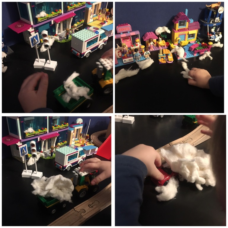 Разложила «снег» (вату) в городе, Ваня с удовольствием нагружал снег в прицеп трактора. Потом «закапывал» в нем машинки