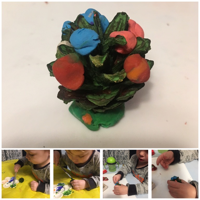 А для бегемотика сделали ёлочку из шишки. Раскрасили гуашью, а позже, когда она высохла украсили игрушками - пластилиновыми шариками.