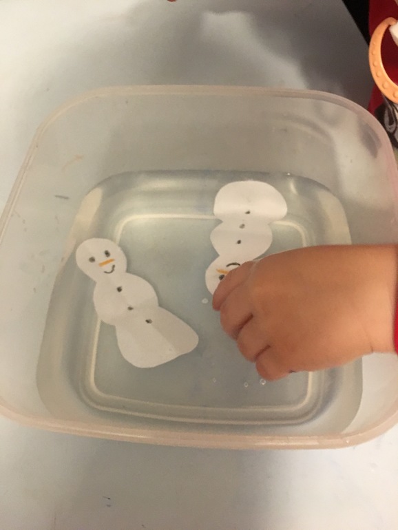 Вечером провели небольшой опыт с водой и сложенными фигурками - «раскрывающиеся снеговички»