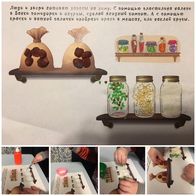 Сделали аппликацию «запасы на зиму»: в мешки положили орешки (пластилиновые шарики), а в банки - крупу (манка,пшено, гречка и рис)